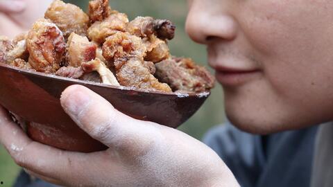 拿到脆皮瓜后,野食小哥并没有立刻开吃,而是现场制作起来。他找来一把小刀,小心翼翼地切开了瓜皮。哇,那瓜皮真是薄得可以透光,让人忍不住想尝一口。